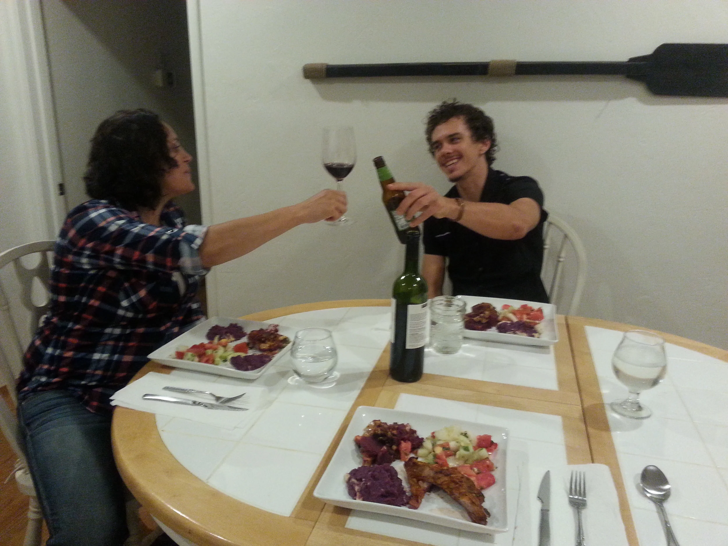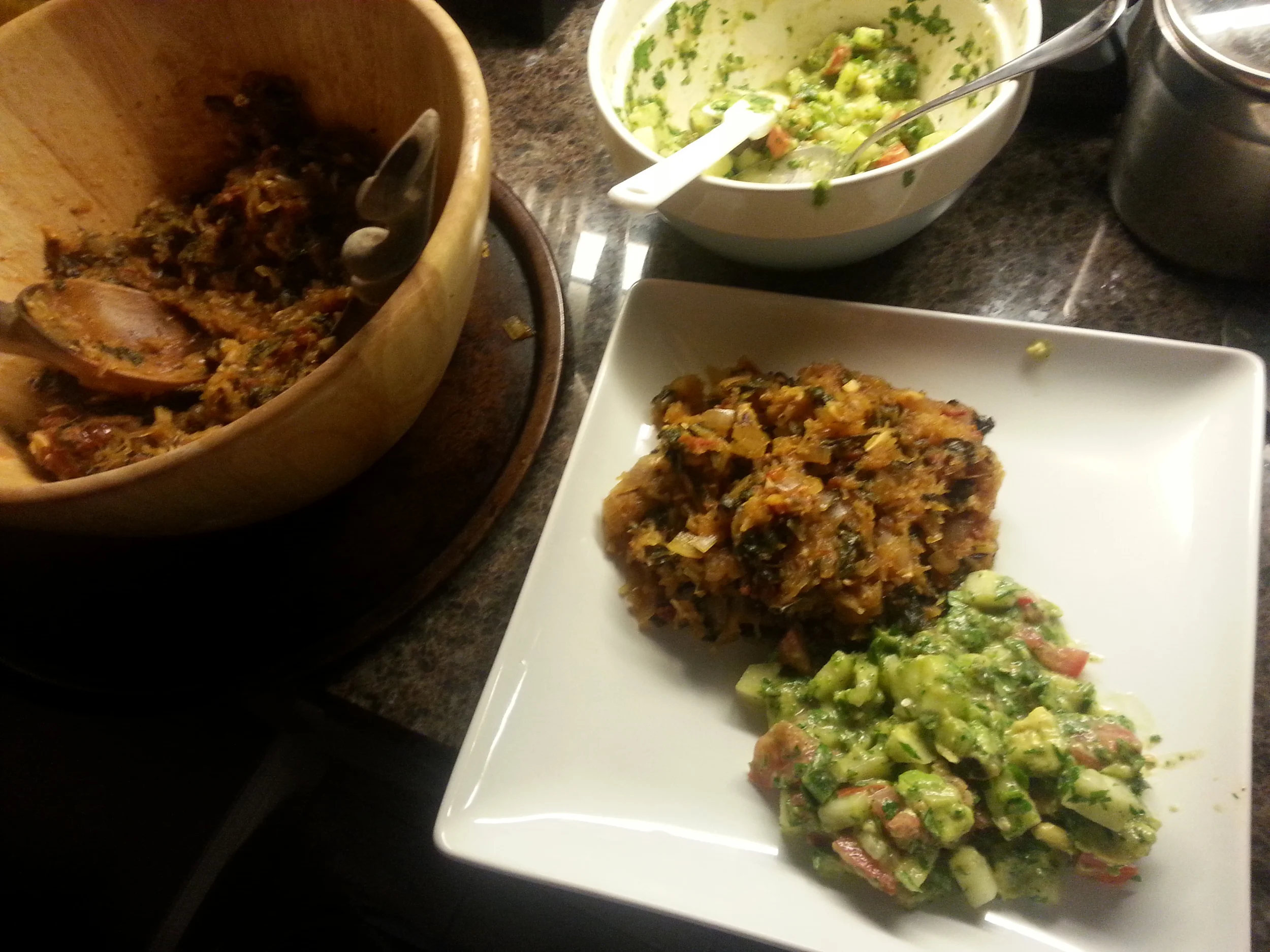 That went in the oven at 375 for one hour to allow the goat butter to marry its flavor with the rest of the dish. I plated the meal up with baked Peruvian Purple Potatoes topped with melted goat and traditional organic cheddar cheese, and Salad Shirazi and it was time to celebrate!